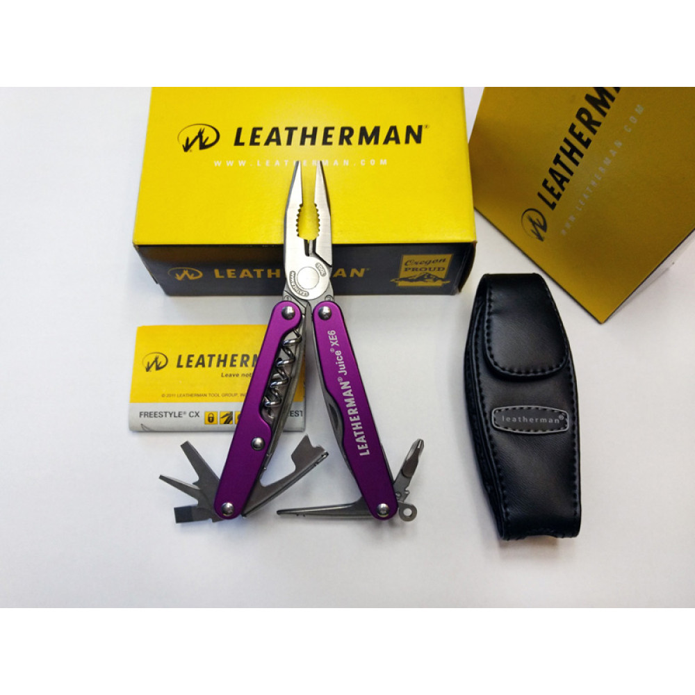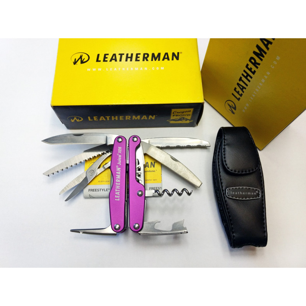 Juice XE6 самий "наворочений" з сім'ї Juice. Яскраво пурпурні алюмінієві рукоятки. На додаток до стандартних пасатижам, кусачкам, викруткам, - XE6 містить пилу, шило, алмазний напилок. Крім того, два гострих ножа: звичайний і серрейторний, ножиці, штопор, відкривачки. Самий функціональний і в той же час, компактний.