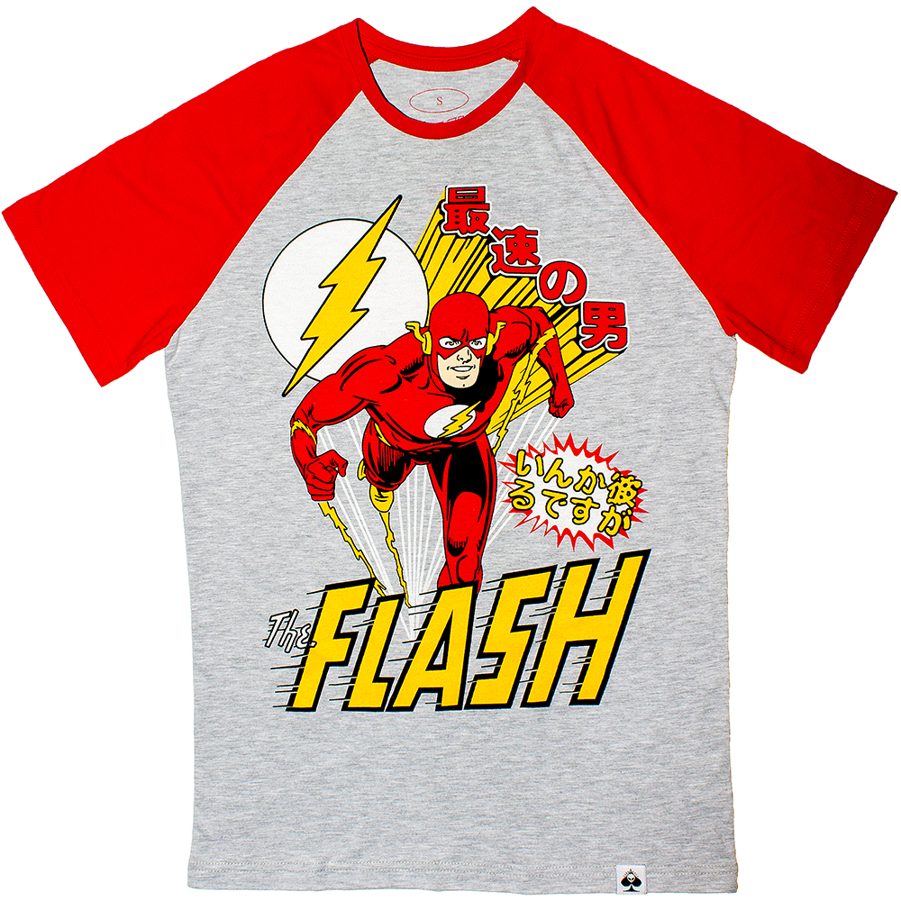 Купити футболку Flash варто для вільного часу на кожен день. Виріб сірого кольору з яскраво червоними рукавами та великим переднім зображенням.