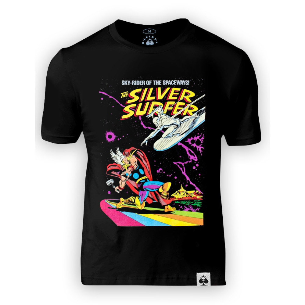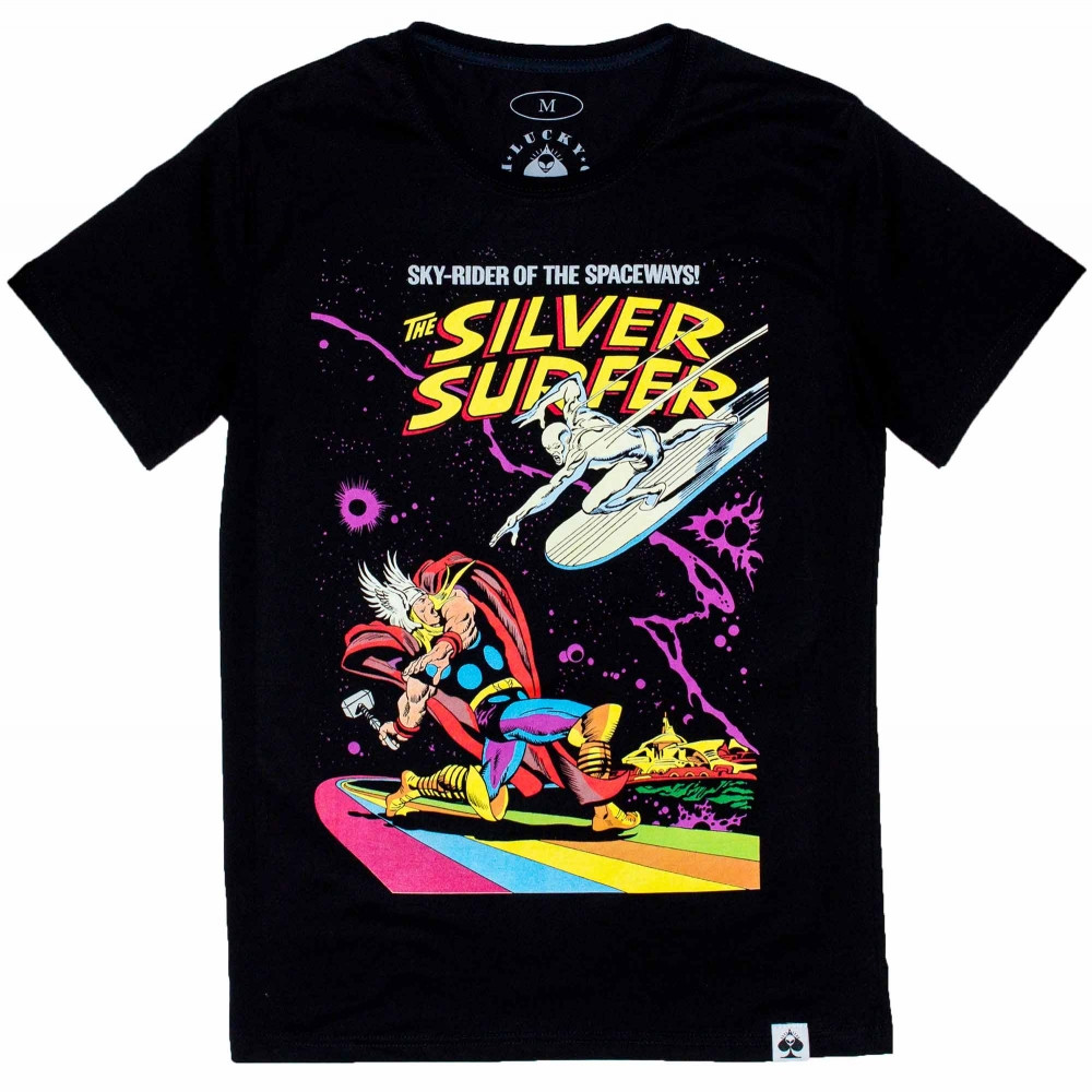 Купити чорну футболку з ефектним принтом Silver Surfer стане чудовим рішенням, аби додати фарб у сірі будні та свій look.
