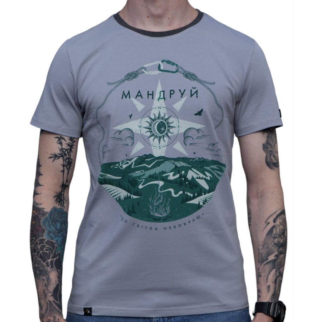 Купити сіру футболку з принтом Мандрівник в зеленуватих контрастних відтінках стане вдалим рішенням як для активного відпочинку, так і повсякденного носіння. Гармонійне зображення на футболці привнесе спокій і комфорт у ваші бурхливі дні. Тканина високої якості з натуральним складом із 95% бавовни та домішкою 5% еластану. Спосіб надруку — шовкотрафарет, plastisol ink. Властивості матеріалів гарантують збереження яскравості на насиченості кольорів навіть після багаторазового прання.